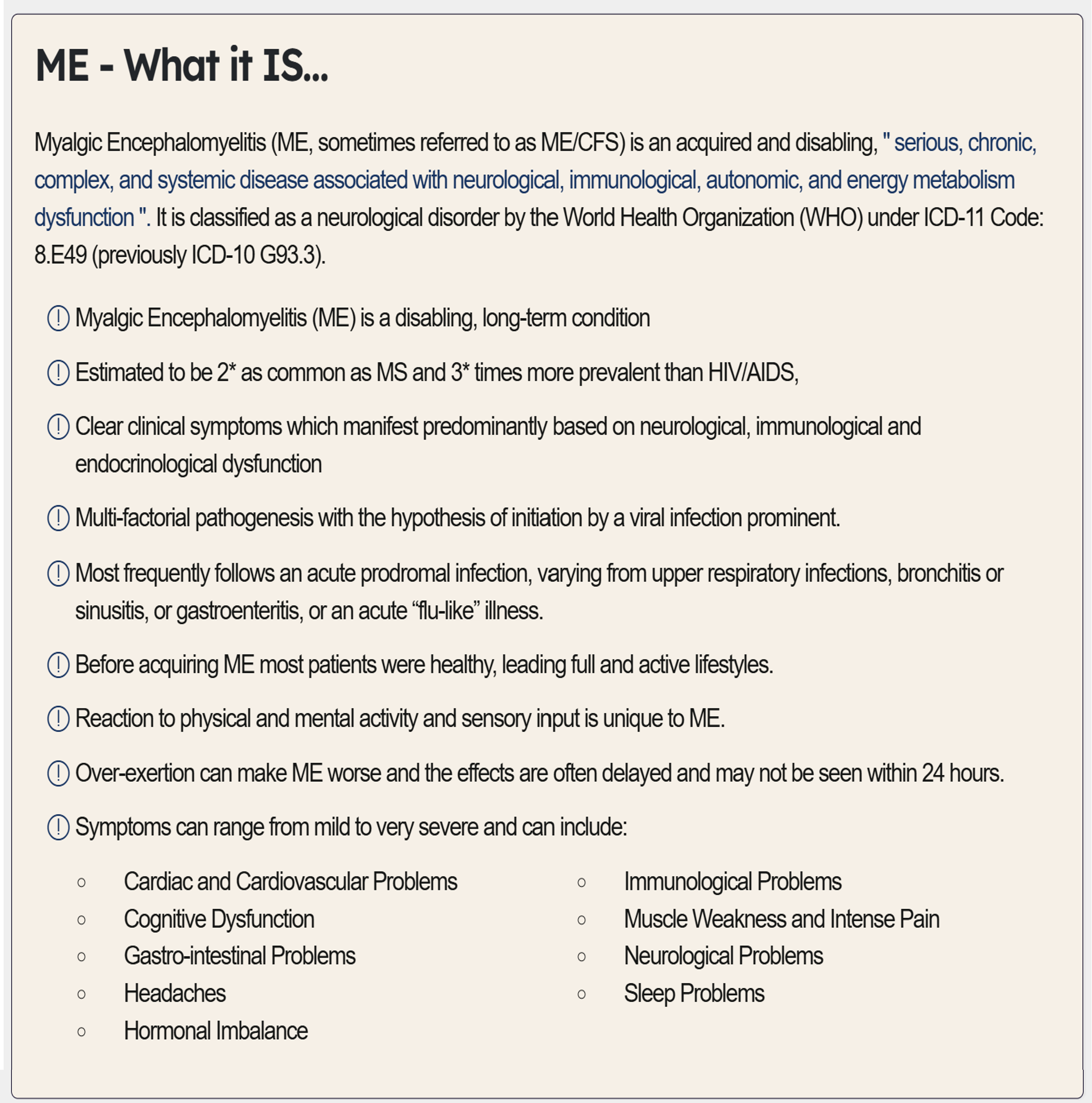 - WHO Classification: Neurological disorder – ICD-10 (G93.3), ICD-11 (8E49) postviral fatigue syndrome